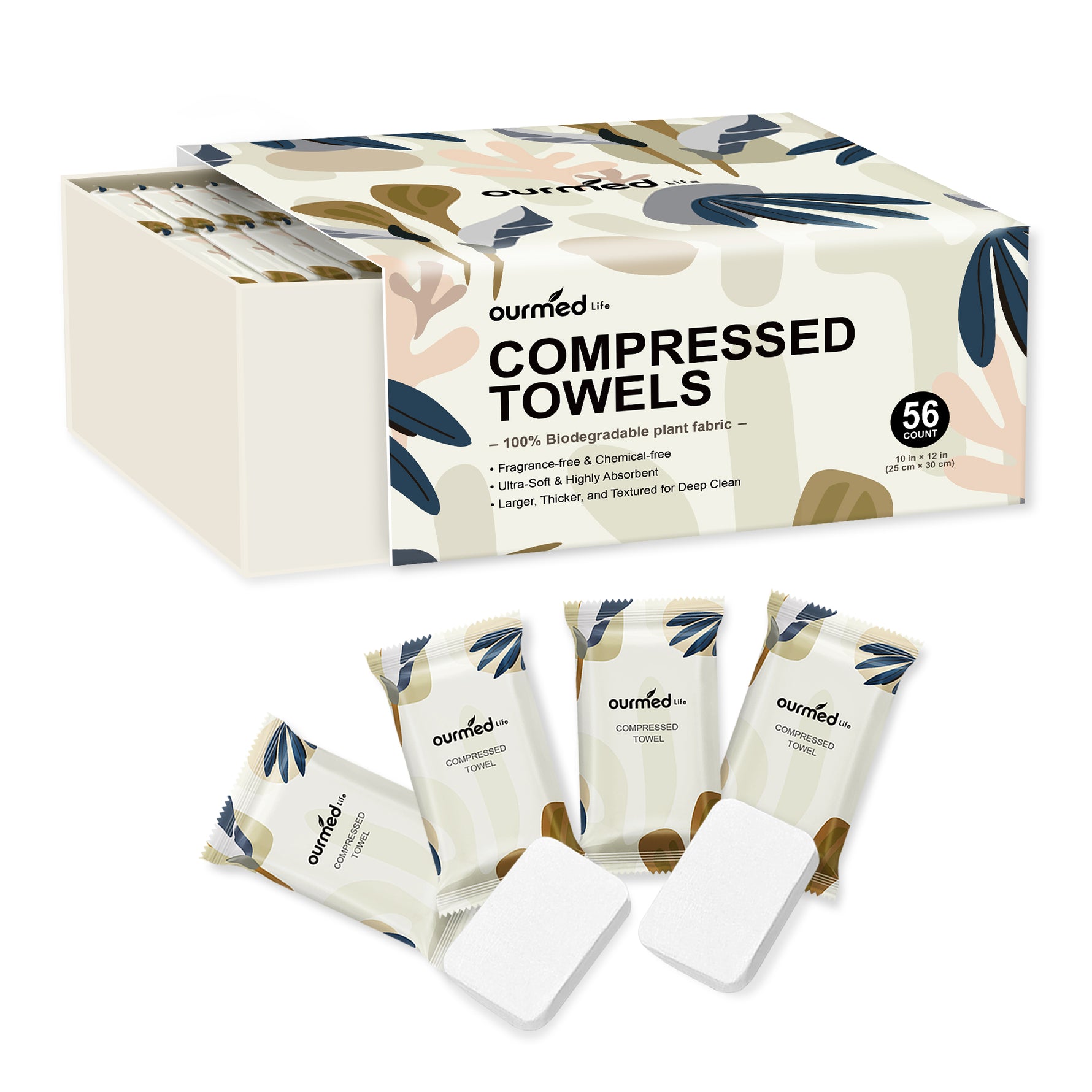 Ourmed Life Portable Disposable Compressed Face Towels for Travel, 56 Count (12" x 10"), Organic Naturalism Boxed